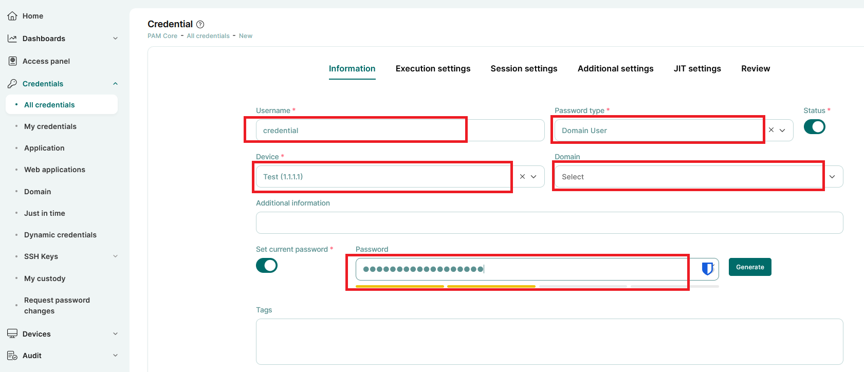 If your domain users are already synchronized with PAM, you need to add the target device to the system first. After that, add the credential in PAM by navigating to: