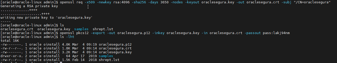 1.1.5 Gerar o certificado autoassinado da credencial do oracle (usuario para hacer login no oracle database). Veja que a CN deve ser igual ao username. Este comando gera uma key e um crt com o CN do usuário oracle: