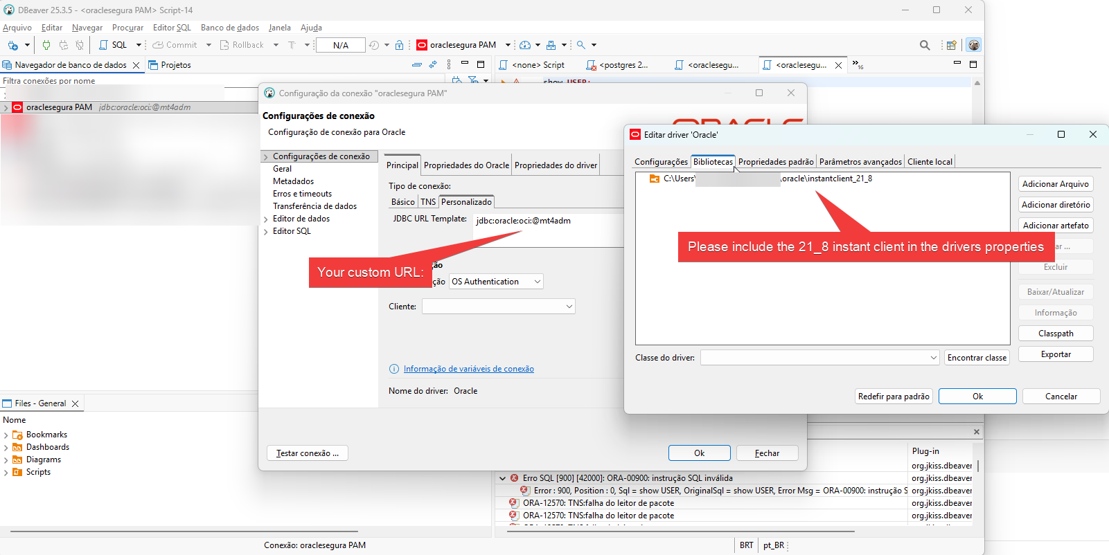 Configuração da conexão, usando a mesma URL de autenticação que o DBEAVER: