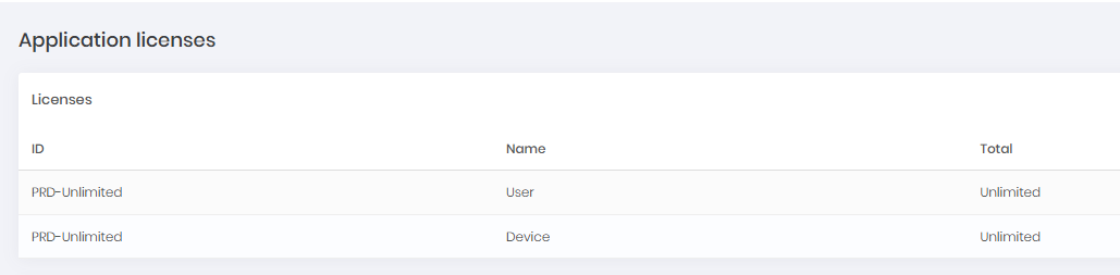 I’m looking at our application licenses and I see that we have “PRD-Unlimited” licenses for both “User” and “Device” types, with the total listed as “Unlimited” for both.
